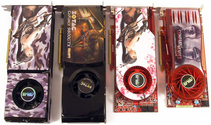 A két HD 4000-es Radeon a 3000-esekhez hasonlóan lényegében ugyanarra a felépítésre alapoz, de az órajelek, a hűtés és a felhasznált memóriachip-generációk eltérnek egymástól. A Radeon HD 4850-ről már esett szó, ő sokaknak igen ismerősnek tűnhet, ugyanis külsőre gyakorlatilag változatlan a Radeon HD 3850-hez képest. Esetében a GPU 625 MHz-en, a memória pedig 1 GHz-en üzemel. A HD 4870 más tészta, ugyanis csak nagy vonalakban hasonlítható a HD 3870-hez, inkább az R600-ra építkező Radeon HD 2900 XT jut róla az ember eszébe. Órajelei 750/1800 MHz-et érnek el, a memória esetében ez nem elírás, a GDDR5-ös chipek effektíve 3,6 GHz-en járnak.