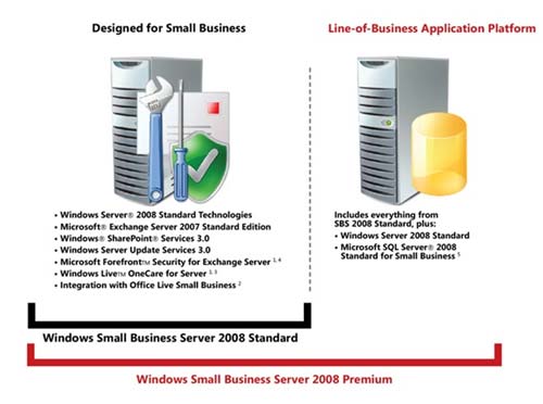 Windows Small Business Server 2008 Két változatban kerül a piacra a SBS 2008: Standard és Premium. A Standard verzió a tipikus egyszerveres csomag, integrálja az Exchange Server 2007 Standard Edition-t, a Windows SharePoint Services 3.0-t, a Microsoft ForeFront Security for Exchange-t