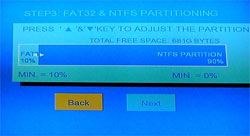 Tehát bekapcsolás után a formázás jön. Négy partíciót kell létrehoznom, ezért itt álljunk meg egy pillanatra. Az első partíciót a timeshift-hez tudom használni, a második részre vehetem fel a TV-műsort, a harmadik egy FAT32-es lesz, ezt tudja a lejátszó írni és olvasni is, a negyedik rész egy NTFS partíció az adatok tárolásához, melyet az eszköz csak olvasni tud. A partíciók méretét nem gigabájtokban, hanem százalékokban kell megadni, de a méretet láthatom gigabájtban is.