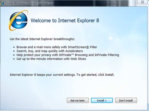 Ahogy ez az előző Internet Explorer megjelenésekor is történt, a Microsoft azoknak a felhasználóknak, akik nem szeretnék frissíteni a meglévő böngészőjüket az új verzióra, elérhetővé tesz egy alkalmazást, az IE 8 Blocker Toolkit-ot, ami megakadályozza majd, hogy az új kiadás feltelepüljön a számítógépükre.
