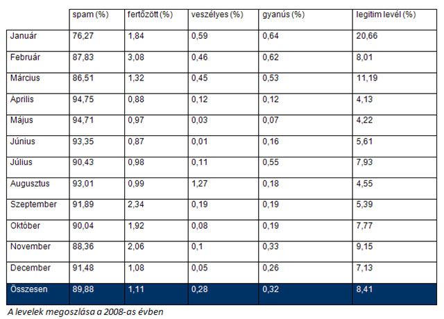 A 2008-as évben mindössze a levelek 8,4%-a bizonyult legitimnek a Panda Security legújabb kimutatásai alapján. A 430 millió elemzett levél 89,88%-a egyszerű spamnek bizonyult, 1,11% pedig rosszindulatú kóddal fertőzve érkezett meg a címzetthez.