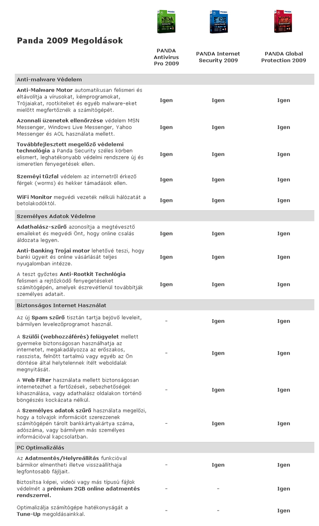 Három változat és mindhárom feltelepíthető három önálló számítógépre. A 2009-es verziók a közösségi alapú vírus felismerés módszerét használják. Állandó, online kapcsolatban vannak a PandaLabs szervereivel, ahonnan akár pár percenként hozzájutnak a legfrissebb vírusok leírásához.