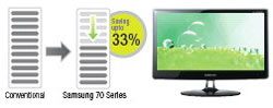 Kivételes energiahatékonyságúak ezek az új megjelenítők. A Samsung ügyel arra, hogy az energiatakarékos technikák alkalmazása ne járjon képminőség romlással. Az új fejlesztéseknek köszönhetően a hagyományos monitoroknál egyharmaddal kevesebb energiát használunk majd fel, amellyel pénzt takarítunk meg és hozzájárulunk - a kevesebb energiahordozó felhasználás révén - a környezetünk élhetőbbé tételéhez a következő generációk számára.