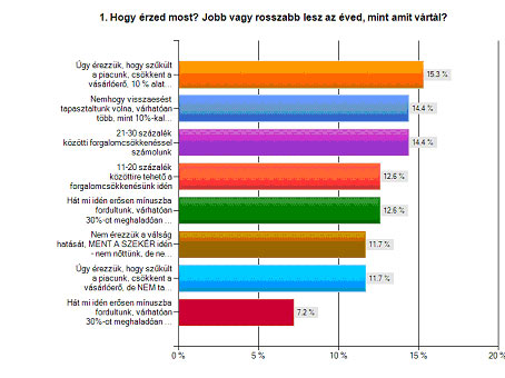 Megkérdeztük az év elején , hogy milyen várakozással tekintetek a 2009-es gazdasági évre. Most, hogy lassan nyakunkon a Szilveszter - na nem most rögtön, azért reméljük addig még sokszor jöttök hozzánk - megismételtük a hangulatfelmérést, hogy lássuk mi lett a megérzésekből és milyenek a kilátásaitok jövőre.