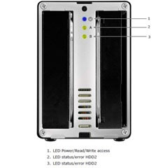 A lázasan dolgozó két merevlemezt egy 40x40 mm-es ventilátor hűti friss levegővel. Irodai környezetben Kensington zárral horgonyozhatjuk le a tárolót, nehogy elvigye valaki. Az előlapon található lámpák tájékoztatnak arról, hogy mi zajlik belül, az egyik led az üzemkész állapotot, írást és olvasást jelzi, a másik kettő pedig az egyes winchesterek esetleges meghibásodását.