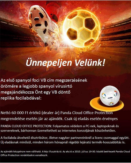 A Panda Security – lévén spanyol cég, ugyebár – nagyon örül, hogy a hazai válogatott ilyen ügyes volt. A spanyol fiestáról pedig van fogalmunk, ha láttuk a nemzeti csapat madridi felvonulását. A spanyol csapat rajongói (mind a válogatotté, mind a Pandáé) egy nagyszerű emléket söpörhetnek be, megszerezhetnek egy vb-s labdát, így: