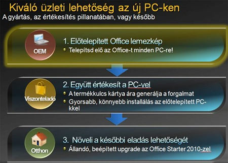 http://oem.microsoft.com/) a rendszerépítő megvásárolja a Microsoft Office 2010 OPK-t, azaz a telepítőkészletet, ami mindhárom verziót (Microsoft Office 2010 Home and Student 2010, Microsoft Office Home and Business 2010 és Microsoft Office Professional 2010) tartalmazza. A telepítőkészlet ára 5 $ vagy 2 $, a telepítés módjától függően és 10 db-os csomagban vehető meg.