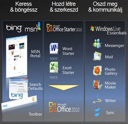 A PC Essential termékcsomag keretében be kell állítanunk az összes netes keresőt a Bing-re és a kezdőlapokat az MSN-re. Telepíteni kell a Bing Bar-t és a Windows Live Wave 4-et, ami a Messenger-t, Mail-t, Photo Gallery-t, Movie Maker-t, Writer-t és a Sync szolgáltatást jelenti. Cserébe kedvezőbb lesz számunkra a Starter ára.