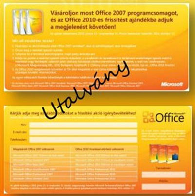 Ami ingyen van, azt nem szabad kihagyni, pláne, ha ilyen nagy értékű szoftverről van szó. Sokan megijedhettek, mert a hivatalos Microsoft források az Office 2010 megjelenésével párhuzamosan meghírdették az Office 2007 vásárlók számára az ingyenes áttérési lehetőséget az új programcsomagra. Azonban - a magyar lokalizáció későbbi megjelenése miatt - a globális akcióban a magyar termékek nem szerepeltek.