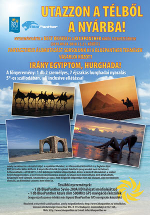 A fenti két újdonságon kívül valamennyi, népszerű BluePanther termékkel részt lehet venni a nagy utazós játékon. A főnyeremény: 1 db 2 személyes, 7 éjszakás hurghadai nyaralás 5*-os szállodában, all inclusive ellátással, utazás repülővel - amely tartalmazza a részvételi díjat, a repülőtéri illetéket, az útlemondási biztosítást, a szervízdíjat, a vízumdíjat, és a foglalási díjat. BBP biztosítás külön köthető. A képek illusztrációk (az ajánlat fakultatív programokat nem tartalmaz).