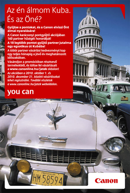 Az én álmom Kuba. És a tied? Gyűjtsd a pontokat a Canon karácsonyi pontgyűjtő akciójában, és a Canon elvisz egy kubai útra, álmaid nyaralására! A Canon központi akciójában 160 partner hűségét honorálják, és a 18 legtöbb pontot gyűjtő partner már repülhet is! Hogy hova? Hát oda, Kubába!