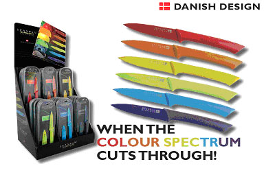 Ezek a színes skandináv design kések ragadás mentes felszínnel rendelkeznek, karbon-rozsdamentes acélból készülnek, high-tech lyukacsos vágóéllel rendelkeznek. A védőtasak hüvelykujjal könnyen eltávolítható, a kések eredeti dán formatervezésűek.