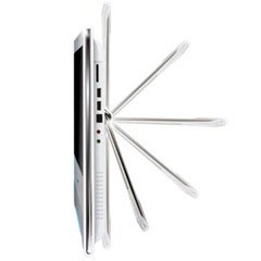 Kár lenne, ha kimaradna a felsorolásból a Shuttle AIO X50 V2 Plus barebone, ami első pillantásra nem is tűnik annak. Egy érintőképernyős modellről van szó, ami nyugdíjba küldi az egeret és a billentyűzetet ott, ahol az alkalmazások vezérlése a képernyő érintésével kényelmesebbé tehető. A kijelző átmérője 15,6 coll, a gép szíve egy takarékos Intel Dual Core ATOM D525 (1,8 GHz). A képről az integrált Intel GMA 3150 grafikus kártya gondoskodik. A teljes konfigurációhoz DDR3 laptop (1333 MHz) memóriát, merevlemezként 2,5" SATA HDD-t vagy SSD-t használhatunk. A tápegysége 40 W-os. A képernyő alatt sztereó hangszórók vannak. A falra (VESA) szerelhető vagy a saját támasztóján az íróasztalon állhat. Ha magunkkal szeretnénk vinni, akkor felhajtható támasztóval aktatáskává változtatható. Fekete és fehér színben kapható, én egy konyhában vagy nappaliban a falon képzelném el, ahol a háziak figyelemmel kísérhetik a közösségi média eseményeit, emailezhetnek vagy éppen megnézhetnek egy filmet.