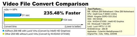 A kötelező szolgáltatásokat persze hozza az Extreme3, van Lucid Virtu szoftver hozzá, ami a második generációs Intel Corei processzorok támogatásával hibrid grafikai rendszer kiépítését teszi lehetővé. Így megfelelő egyensúlyt állíthatunk fel az extrém grafikus képességek és a kedvező fogyasztás között. Az Asrock mérései szerint például a video fájl konvertálás 235 százalékkal gyorsabban elkészül a processzorba integrált Intel HD Graphics 2000/3000 GPU-val, mint egy NVidia GTX580-nal, ez igazán figyelemre méltó.