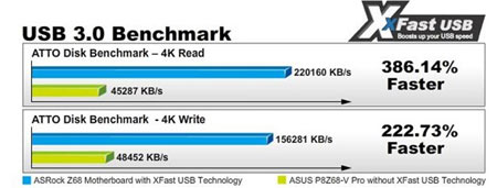 Az Asrock XFast USB névre keresztelt USB 3.0 csatlakozói más Z68 alaplapoknál gyorsabb USB 3.0 adatátvitellel kecsegtetnek. Az adatok írásánál az Asrock tapasztalatai szerint 3,86-szor gyorsabban jöttek át a byte-ok, mint egy szokásos USB 3.0 kapun. Az írás során 2,22-szeres gyorsulást ígérnek.