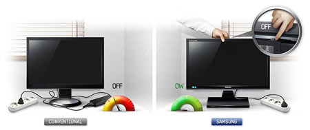 Az energiatakarékosság nem kizárólag az alacsony fogyasztáson múlik ám. Amikor nem használunk egy elektromos berendezést, a tápegysége akkor is a hálózaton lóg, és ha minimális mennyiséget is, de akkor is fogyaszt. Az SA200 On / Off adapterének használatával – ami egy mechanikus kapcsoló – bonthatjuk az áramkört és a hagyományos készenléti mód 1 wattos fogyasztását valóban 0-ra csökkenthetjük. Amikor este elmegyünk haza, kapcsoljuk le a monitort, így az a következő munkanap reggelig nem terheli a költségeinket.