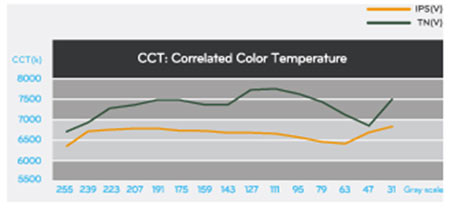 Az IPS másik jellegzetessége, hogy kevesebb a változás a kép színhőmérsékletében, aminek köszönhetően úgy érezhetjük, hogy a színek megegyeznek az eredeti képen láthatókkal. A TN paneleknél előfordulhat, hogy a túlnyomóan kék vagy piros színt tartalmazó képek esetében a színhőmérséklet eltolódik és az egész kép kékes vagy pirosas lesz. Az IPS kiegyensúlyozza a színhőmérsékletet és folyamatosan közel 6500K-n tartja.