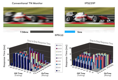 A két technológia közötti követező eltérés a képváltások reakcióidejében található. A TN monitorok válaszideje viszonylag nagy mértékben változik, míg az IPS monitorok esetében ez azonos szinten marad.