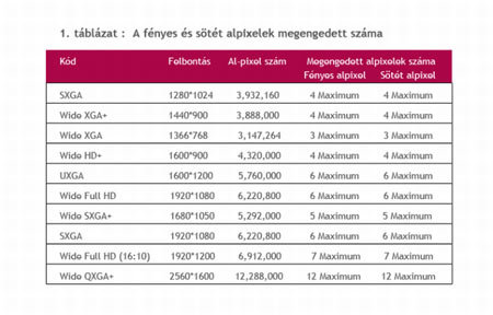 Az LCD panel gyártása során keletkezhetnek fényes illetve sötét alpixelek, de ez az LCD panel működésére nincs hatással. Ilyenkor világos vagy sötét pontok jelenhetnek meg a képernyőn. Ez a jelenség akkor fordulhat elő, amikor egy folyadékkristály-réteg nem a várt módon működik az LCD monitor használata közben. Néhány fényes vagy sötét alpixel előfordulása tehát nem tekintendő hibának, az LCD monitor pedig akkor cserélendő, ha a fényes vagy sötét alpixelek száma a felbontás függvényében meghaladja a 1. táblázatban szereplő alpixelszámot a garanciális időszak alatt. Ugyanakkor minden LG monitor 72 órás pixelgaranciával rendelkezik, 72 óra után az alábbi táblázat szerint alakul a garancia.