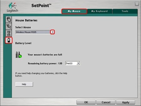 Végül, a legalsó fülön, az elem rendelkezésre állásáról kaphatunk infót: az eddigi használat mellett még hány napig bírja életben tartani az egerünket az áramforrás. Egy alkáli elem úgy 4 hónapig bírja, ezt elősegíthetjük azzal is, hogy használaton kívül az egér alján levő kapcsolóval kikapcsoljuk az egeret, illetve lehetőleg világos, nem átlátszó vagy tükröződő felületen használjuk.