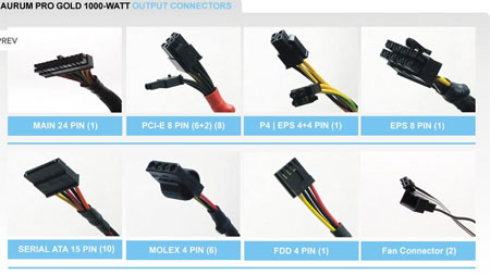 A moduláris felépítésből adódóan az FSP bőséggel ellát bennünket kábelekkel, válogassunk belőlük nyugodtan. Egy Aurum Pro akár négy grafikus kártyához elegendő csatlakozója mellett plusz két külön ventilátor szabályzott energiaellátását tudja megoldani. A két kiegészítő ventilátor mondjuk a grafikus kártyák hűtésébe segíthet be, miközben a fordulatszámuk a tápegység hőmérsékletétől függően változik, ami jótékony hatással van az egész konfigurációból áradó átlagos zajszintre.