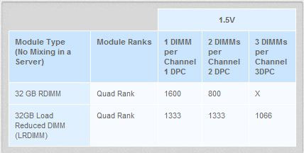 A 32GB-os RDIMM és a 32 GB-os LRDIMM is fizikailag Quad Rank modul, a különbség az, hogy az LRDIMM technológia on-module buffers-t használ, ami kívülről a memória kezelő számára egy Dual Rank mudolnak tűnik. Így az Intel E5 szerverben az összes memória foglalatba tehető LRDIMM modul, míg a 32GB-os RDIMM esetében a számuk limitálva van 2 DIMM per csatornára.