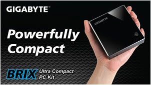 A Gigabyte BRIX gy miniatürizált PC, ami alig nagyobb egy tenyérnél. Memóriával és mSATA SSD-vel komplettírozható irodai gépnek, otthoni PC-nek vagy HTPC-nek. Mindegy is a cél, a lényeg, hogy bárhová elrejthető a kis doboz.