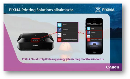 A Canon a megújult PIXMA termékcsaláddal együtt frissítette a PIXMA Cloud Link szolgáltatást és a PIXMA PRINTING SOLUTIONS alkalmazás. A nyomtató TFT paneljéről közvetlenül érhető el a közösségi háló, illetve mobilkészülékről közvetlenül a nyomtató, még a tinta szintjét vagy a kézikönyvet is ellenőrizhetjük.
