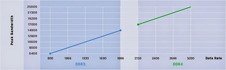 A DDR4 memóriák kb. másfélszer nagyobb teljesítményre képesek, mint a DDR3 modulok felső határa. A belépő frekvencia szint 2133 MHz és a várható leggyorsabb memória modulok akár 3200 MHz főlé is benézhetnek.