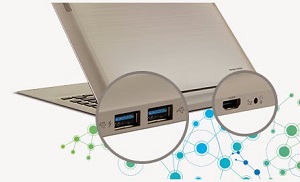 A külső világgal a kommunikációt a dokkolón található két darab gyors USB 3.0 portokkal valósíthatjuk meg. Az USB kapuk a Sleep-and-Charge funkciót támogatják, kikapcsolt állapotban töltésre használhatóak vagy zenehallgatáshoz próbáld ki a Sleep-and-Music technológiát. A dokkolón van még egy nagy méretű SD kártyaolvasó.