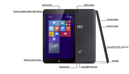 A Goclever Insignia 800 Win tablet 1280 x 800 képpont felbontású, nyolc collos IPS LCD képernyővel rendelkezik, amely 5 ponton érzékel. Négymagos Z3735E processzor működik benne és Intel HD grafika áll a rendelkezésre. A memória 1 GB, a háttértár 16 GB és akár egy 64 GB-os microSDXC memóriakártyával is bővíthető. Kettő, illetve 5 megapixeles kamerák vannak a két oldalon. Átlagos internetezési idő egy feltöltéssel egy munkanap, kb. 6-8 óra.