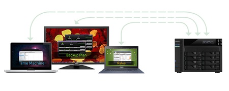 Az ASUSTOR NAS komplett adatmentési megoldást szolgáltat még úgynevezett hibrid vállalati környezetekben is. Könnyen időzíthetőek az adatmentések időpontjai, de kézzel is bármikor elindítható egy soron kívüli backup. Mindegy, hogy Windows (Backup Plan), Mac OS X (Time Machine) vagy Unix alapú operációs rendszer (Ralus) fut-e a kliens gépen, de ugyanúgy használható tabletek, laptopok és okostelefonok adatmentéséhez is.