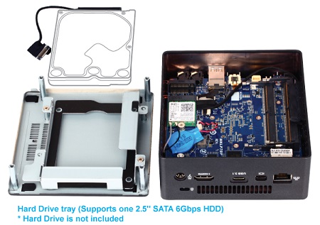 A barebone 2 db 1,35V-os SODIMM DDR3 memóriával 16GB-ig bővíthető. Az Intel HD Graphics 6000 GPU-hoz 1 db mini HDMI 1.4a vagy 1 db mini DisplayPort 1.2 kapun vezet az út. Két-két USB 3.0 és USB 2.0 port van a dobozon és még két USB 2.0 kivezetést az alaplapról oldhatunk meg. Az egyik USB port töltésre is alkalmas. Infra szenzor és kártyaolvasó erősíti az extrákat.