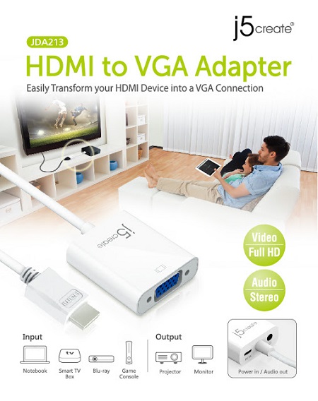 A JDA213-60B HDMI -> VGA adapter ugyanilyen egyszerű, de nagyon hasznos kiegészítő. A HDMI-ről vett jelet alakíthatod át egy VGA bemenetű projektorra vagy monitorra. Az eszköz a két csatornás analóg hangot különválasztja, amit egy szabványos jack aljzatról vihetsz tovább. Az átalakító 1080p képet max. 1920x1200 pixeles felbontásban tud.