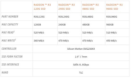 Az AMD a Radeon név ismertségében bízva a többi - memória, SSD - termékeit is e márka alatt jelenteti meg. Volt már korábban is Radeon SSD, azonban az árversenybe visszalépni egy igazán költséghatékony megoldással érdemes. Ez lett a TLC alapokon készülő Radeon R3 SSD, amely 120GB, 240GB, 480GB, majd később 960GB tárterülettel vásárolható meg.