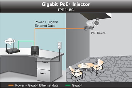 A TPE-115GI Gigabit PoE+ injektorral megspórolhatsz egy PoE switch beszerzését. A hagyományos, non-PoE gigabites switch-hez csatlakoztatva akár 100-es Ethernet kábelt is kihúzhatsz a hálózati PoE+ és PoE eszközeidhez. Az integrált tápegysége csökkenti a további vezetékek, eszközök számát. Kiválóan alkalmas PoE access point-ok vagy IP kamerák telepítéséhez.