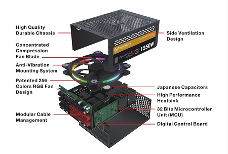 A kevesebb hőkibocsátás sokféle előnye közül az egyik, hogy alkatrészeket a gyártó jobban össze tudja sűríteni, könnyebb, kisebb tápokat tud gyártani. A felszabaduló helyre például kiegészítő hűtőbordákat szerelhet, ahogy a Thermaltake is teszi, így már 60% terhelési szint alatt a ventilátor lekapcsolható és a tápegység néma üzemmódban üzemeltethető. A hűtőbordák nyilván a ventilátor munkáját is sokkal egyszerűbbé teszik.