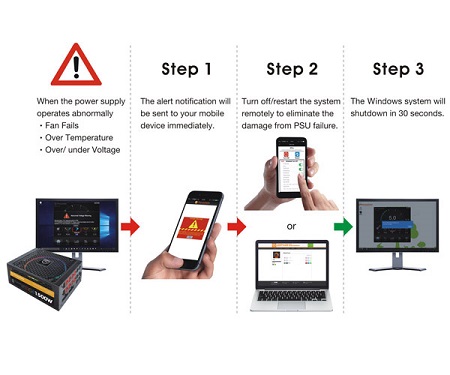A mobil applikációval a rendszer felügyelete mellett a rendellenes viselkedésről (meghibásodás, túlmelegedés) riasztások fogadhatók a mobilon és a számítógép távolról is leállítható, ha szükséges.