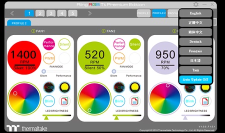 Az app a színpaletták, a LED fényerő, a forgási sebesség módosítása mellett tartalmaz véletlenszerű színgenerátort, ciklikus és villogó RGB sémákat is. A mobil applikáció használatához a PC-n a Thermaltake RGB 2.0 programnak kell futnia. Jelenleg mobilon keresztül a Thermaltake rendszerhűtő ventilátorokból a TT RGB Premium Edition sorozat 120mm-es és 140mm-es modelljei vezérelhetőek. Nálunk a CL-F042-PL12SW-A modell van készleten.