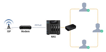 És végül a negyedik új funkciónk a szélessávú PPPoE szolgáltatás, mellyel a felhasználó közvetlenül megkapja a saját ISP szolgáltatása által kiosztott IP címet, hogy telefonos kapcsolatot hozhasson létre a NAS-on keresztül. A felhasználó egy zárt rendszer keretein belül maradhat és megkíméli magát attól, hogy a külső router konfigurációkkal keljen bajlódnia. A legjobb biztonság érdekében ajánlott ezt a funkciót ASUSTOR Multi-Layer Protection Plan-nal együtt használni.