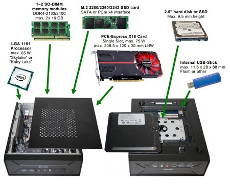 A 3 literes térfogat ellenére akár egy közepes teljesítményű grafikus kártya is elfér a PCIe csatlakozó felett. A beépíthető kártya 208.5 mm hosszú lehet és 120 mm magas, valamint legfeljebb 30 mm széles. Mellé még egy Intel Core i7-7700 processzor vagy összesen 32 GB memória is szerelhető, ha ki szeretnéd maxolni a teljesítményt.
