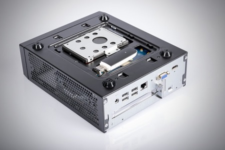 Egy darab 2,5 collos meghajtót tudsz a barebone-ba építeni. Találsz még az alaplapon belül egy USB portot, amelybe egy fíx telepítésű USB eszközt, mondjuk egy hardver kulcsnak használt pendrive-ot érdemes csatlakoztatni.