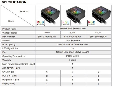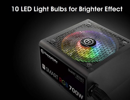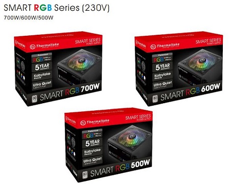 A Thermaltake Smart RGB tápcsalád 500W, 600W és 700W teljesítménnyel készül és 80+ Standard minősítéssel rendelkezik. Itt szükséges megemlíteni, hogy már az új EU 230V előírásoknak megfelelve. Válogatott, kiváló minőségű alkatrészekből épül fel, egyedisége pedig a ventilátor körül világító LED fény.