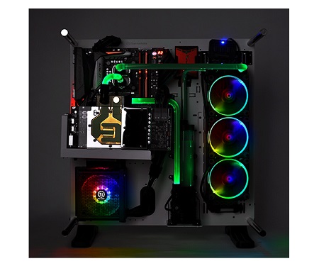 Sok egyszerű világító megoldásban csak 3-4 LED világít, ami a forgó ventilátor miatt gyenge és zavaróan vibráló. A Thermaltake az erősebb és egyenletesebb fényhatás érdekében 10 LED-et alkalmaz.