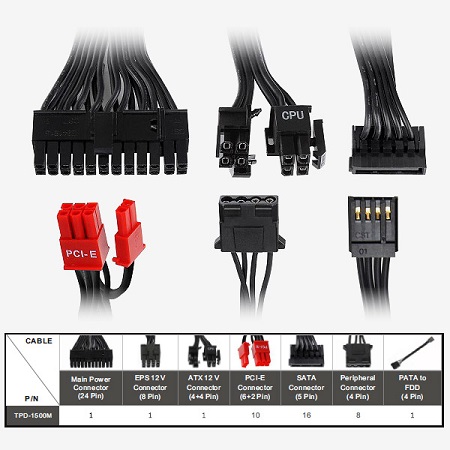 A kábeleken a Toughpower 1500W GOLD tápegység 90 százalékos hatékonysággal préseli át az energiát, tartva a 80 PLUS Gold szint előírásait.