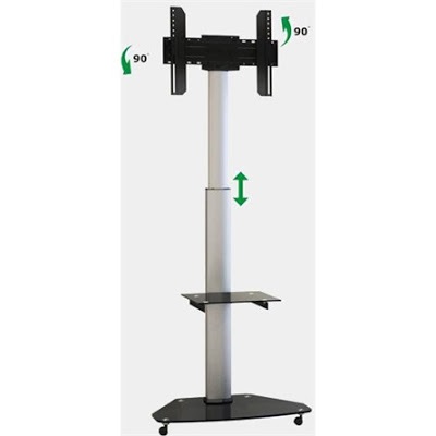 LCD-, LED TV padlóállvány akár 65" átmérőjű képernyőkhöz. A TV középvonala a padlótól 1325-1910 mm-re állítható. A televízió vertikálisan 90 fokban elforgatható. Fixálható kerekek, két üveg polc.
