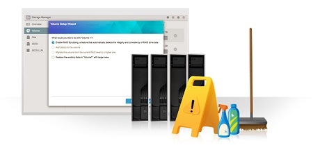 A RAID Scrubbing ellenőrzi a RAID 5 és a RAID 6 meghajtókon levő adatok integritását és konzisztenciáját. Ennek az új funkciónak a rendszeres használata segít az adatok integritásának megerősítésében, az eltérések felderítésében és kijavításában. Ha nem javítható hibába fut, akkor a NAS azonnal figyelmeztetést küld, hogy minél hamarabb reagálhass a váratlan problémákra.