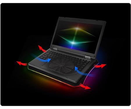 Az ergonomikus dizájn egyrészről a hűtés érdekében került kialakításra. Bármilyen laptop elforgatás vagy elcsúsztatás nélkül hűthető a 200 mm-es ventilátorral, egészen 19 inch képernyőméretig. Másrészről különleges forma adja magát, hogy egyedi háttérvilágítást nyújtson az éjszakai munkához vagy játékhoz. Sokak igénye a laptophoz, hogy valamiféle fény is segítse esténként a billentyűzeten megtalálni a gombokat.