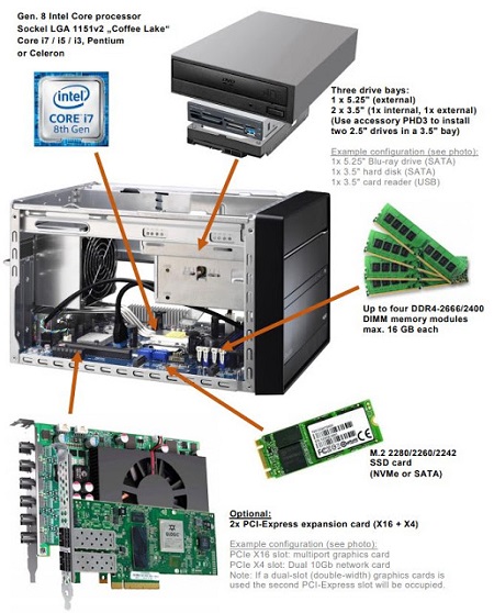 A fekete, alumíniumból készített ház méretei 33.2 x 21.6 x 19.8 cm, ebben elegendő hely lesz négy darab SATA meghajtónak, az 5,25" optikai meghajtóval együtt. Továbbá egy PCI Express x16 3.0 aljzat és még egy PCI Express x4 3.0 csatlakozó egy lehetséges bővítőkártya számára. Ez utóbbit a dupla széles grafikus kártya elfoglalhatja. Két M.2 aljzat alkalmas lehet például egy WLAN (M.2-2230) modul vagy egy NVMe SSD (M.2-2280) beépítésére.