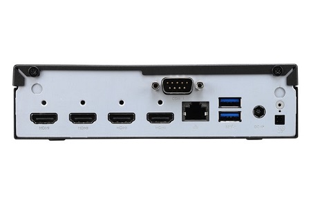 A DH02U mérete 19 x 16.5 x 4.3 cm, a hátoldalán találod a négy darab HDMI 2.0b portot, az Intel Gigabit Ethernet csatlakozóját, USB 3.0-t, RS-232 aljzatot és egy 4 tűs csatlakozási lehetőséget a külső bekapcsoló gomb számára. Az előlapra került két darab USB 3.0 és USB 2.0 portok, az audió csatlakozók társaságában.